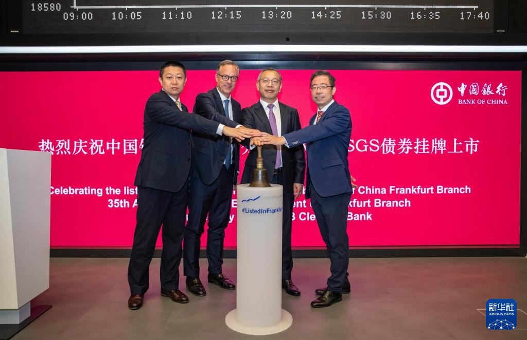8月26日,在德國法蘭克福證券交易所,嘉賓在搖鈴儀式上合影。新華社記者 張帆 攝 SGS是可持續發展掛鈎貸款、綠色貸款和社會責任貸款三類貸款合集的簡稱。中國銀行官網日前宣布,中行法蘭克福分行SGS債券8月13日成功發行,規模為25億元人民幣,品種為2年期固息。