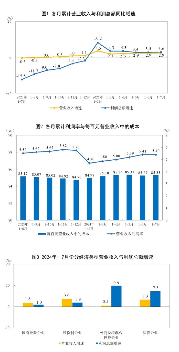 香港新聞網8月27日電 據中國國家統計局官方微信公眾號消息,1—7月份,全國規模以上工業企業實現利潤總額40991.7億元,同比增長3.6%(按可比口徑計算)。 1—7月份,規模以上工業企業中,國有控股企業實現利潤總額13917.3億元,同比增長1.0%;股份制企業實現利潤總額30514.6億元,增長1.9%;外商及港澳台投資企業實現利潤總額10184.9億元,增長9.9%;私營企業實現利潤總額11031.0億元,增長7.3%。 1—7月份,採礦業實現利潤總額7179.2億元,同比下降9.5%;製造業實現利潤總額29045.4億元,增長5.0%;電力、熱力、燃氣及水生產和供應業實現利潤總額4767.1億元,增長20.1%。 1—7月份,主要行業利潤情況如下:有色金屬冶煉和壓延加工業利潤同比增長79.3%,計算機、通信和其他電子設備製造業增長25.1%,農副食品加工業增長23.9%,電力、熱力生產和供應業增長23.2%,紡織業增長18.4%,汽車製造業增長6.7%,石油和天然氣開採業增長5.3%,化學原料和化學製品製造業增長4.8%,通用設備製造業增長4.3%,專用設備製造業下降2.9%,電氣機械和器材製造業下降8.1%,煤炭開採和洗選業下降21.7%,非金屬礦物製品業下降48.8%,石油煤炭及其他燃料加工業、黑色金屬冶煉和壓延加工業同比由盈轉虧。 1—7月份,規模以上工業企業實現營業收入75.93萬億元,同比增長2.9%;發生營業成本64.79萬億元,增長3.0%;營業收入利潤率為5.40%,同比提高0.04個百分點。 7月末,規模以上工業企業資產總計172.76萬億元,同比增長5.3%;負債合計99.51萬億元,增長5.1%;所有者權益合計73.25萬億元,增長5.7%;資產負債率為57.6%,同比下降0.1個百分點。 7月末,規模以上工業企業應收賬款25.10萬億元,同比增長8.1%;產成品存貨6.47萬億元,增長5.2%。 1—7月份,規模以上工業企業每百元營業收入中的成本為85.33元,同比增加0.09元;每百元營業收入中的費用為8.41元,同比持平。 7月末,規模以上工業企業每百元資產實現的營業收入為76.4元,同比減少2.3元;人均營業收入為179.4萬元,同比增加7.8萬元;產成品存貨周轉天數為20.4天,同比增加0.2天;應收賬款平均回收期為66.5天,同比增加3.4天。 7月份,規模以上工業企業實現利潤同比增長4.1%。