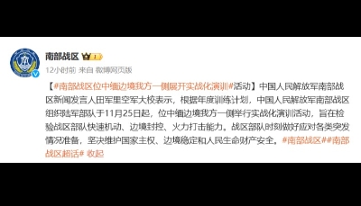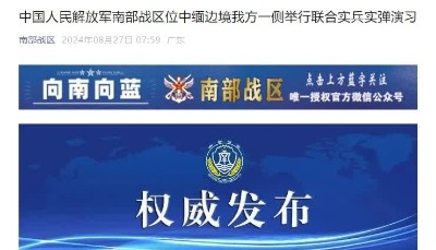 中緬兩軍邊境演習 穩定地區局勢香港中通社8月27日電(香港中通社記者關秀英)中國人民解放軍南部戰區新聞發言人田軍里空軍大校27日表示,中國南部戰區組織陸軍、空軍部隊於當日起至29日,於中緬邊境中方一側舉行聯合實兵實彈演習,旨在檢驗戰區部隊偵察預警、立體封控、火力打擊能力。軍事專家認為,中國此舉是希望防患於未然,讓中國在該地區的國家安全能夠得到保障,屬於有比較強針對性的自衛性警告。
