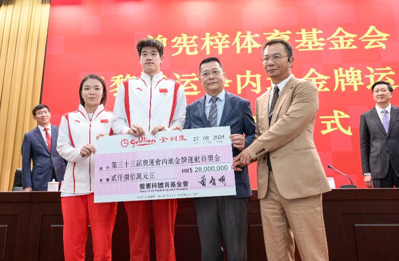 據紫荊網報道,曾憲梓體育基金會理事長曾智明、副理事長曾智雄向巴黎奧運會內地金牌運動員頒發了獎金支票,獎金總額為港幣2800萬元。國家體育總局局長高志丹,副局長周進強以及巴黎奧運會金牌運動員代表出席頒獎儀式。