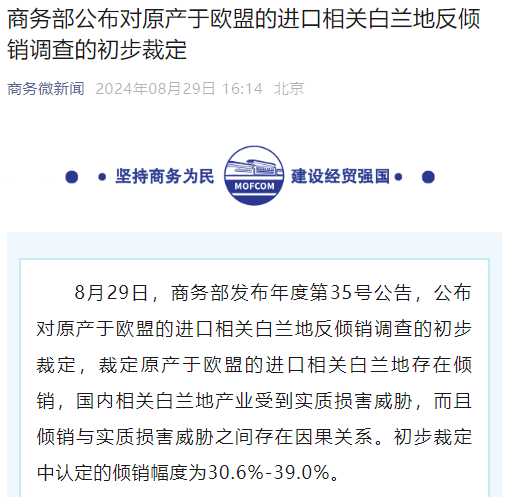 香港中通社8月29日電 中國商務部29日發布年度第35號公告,初步裁定對原產於歐盟的進口相關白蘭地反傾銷調查存在傾銷。