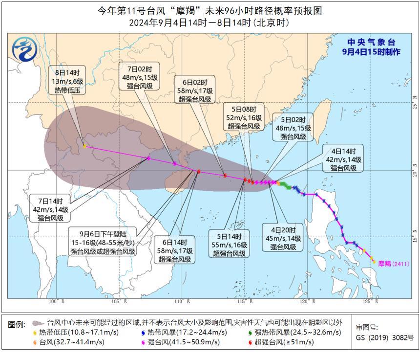 香港新聞網9月4日電 據中國海南省氣象局消息,颱風“摩羯”14時由颱風級加強為強颱風級,其中心位於北緯19.1度、東經117.4度,也就是在距離海南省文昌市偏東方向約690公里的南海東部海面上,中心附近最大風力14級(42米/秒),預計,“摩羯”將以每小時10-15公里的速度向西偏北方向移動,強度逐漸加強,於6日中午到夜間在海南瓊海到廣東電白一帶沿海登陸,登陸時強度可達強颱風級或超強颱風級(48-58米/秒,15-17級),7日凌晨移入北部灣海面。