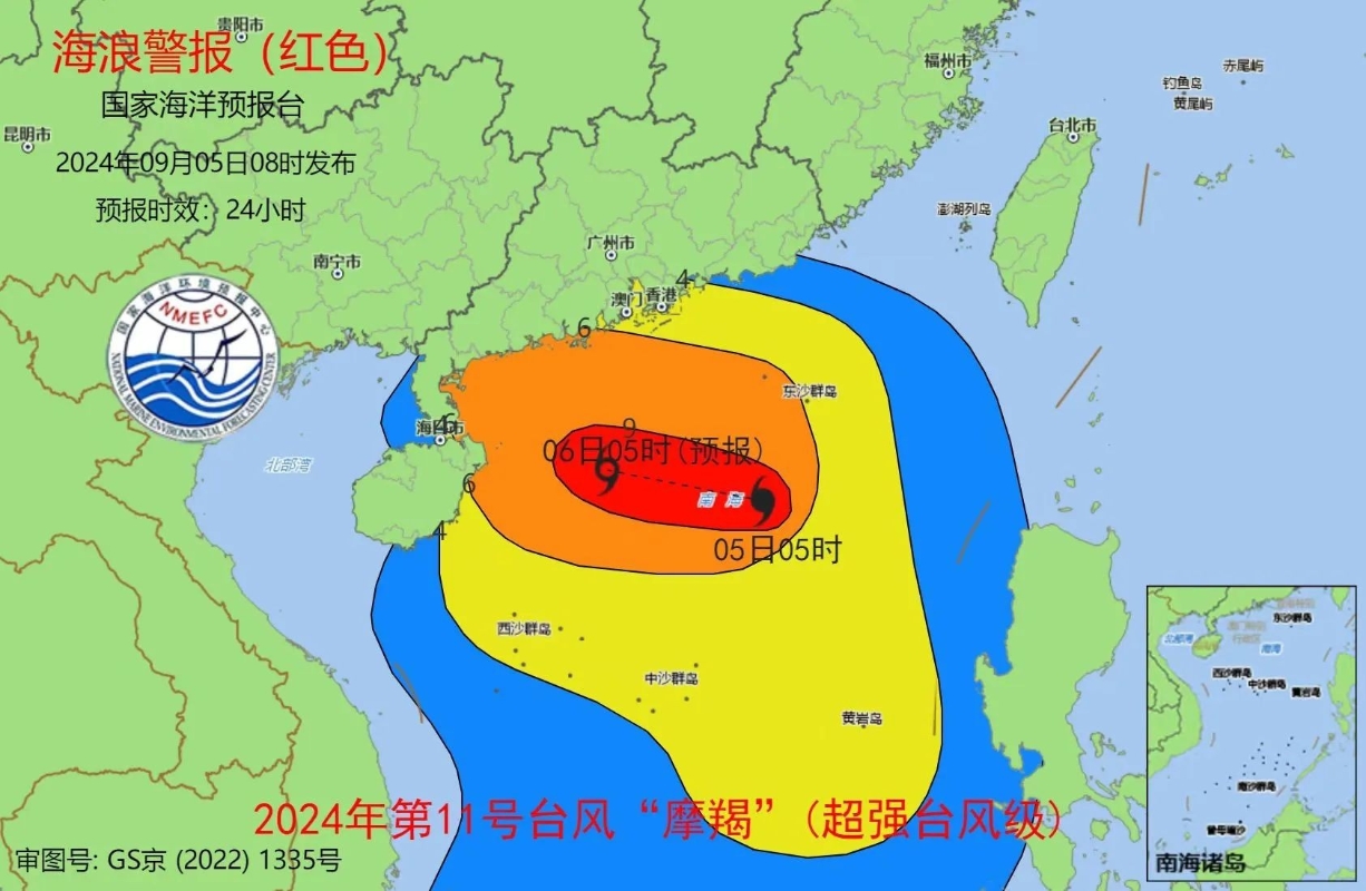 香港新聞網9月5日電 今年第11號颱風“摩羯”已於昨天(9月4日)晚上加強為超強颱風級,受其影響預計中國廣東、海南近岸海域將有巨浪到狂浪,中國國家海洋預報台今天(9月5日)早上將海浪預警級別升級為紅色,並發佈風暴潮黃色警報。 超強颱風“摩羯”今天8時中心位於廣東徐聞東偏南方大約600公里的南海北部海面上。據中央氣象台預計,“摩羯”將向偏西方向移動,強度變化不大,將於6日下午至夜間在海南瓊海到廣東電白一帶沿海登陸,7日凌晨移入北部灣海面,爾後趨向中越交界,強度逐漸減弱。 海浪方面 預計9月5日中午到6日中午,南海北部將出現8到13米的狂浪到狂濤區,近海海域海浪預警級別為橙色;廣東西部、海南東部近岸海域將出現4到6米的巨浪到狂浪,該近岸海域海浪預警級別為紅色,廣東東部近岸海域將出現2.5到4米的大浪到巨浪,該近岸海域海浪預警級別為黃色。