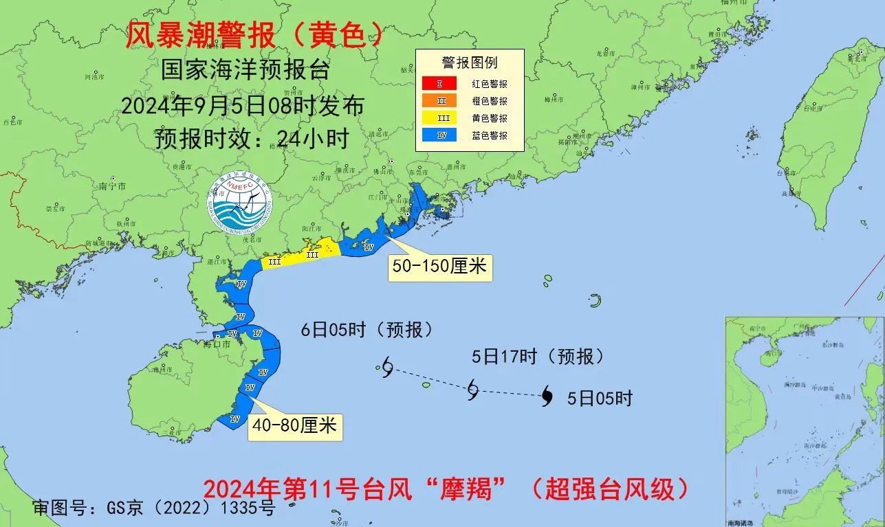風暴潮方面 預計9月5日上午至6日上午,廣東珠江口到雷州半島東岸沿海將出現50到150厘米的風暴增水,海南島東北部沿海將出現40到80厘米的風暴增水。廣東省陽江市和茂名市的風暴潮預警級別為黃色,廣東省廣州市、中山市、珠海市、江門市、湛江市和海南省海口市的風暴潮預警級別為藍色。