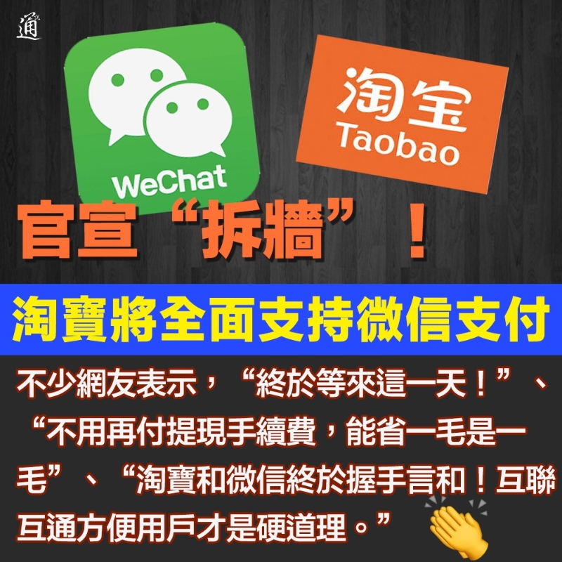 官宣“拆牆”!淘寶將全面支持微信支付分享到: