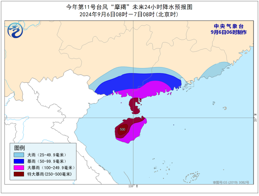 降水預報:9月6日08時至7日08時,廣西東南部、廣東西南部和海南島等地有大到暴雨,其中部分地區有大暴雨,廣東西南部沿海、海南島中西部和北部局地特大暴雨(250~500毫米)。