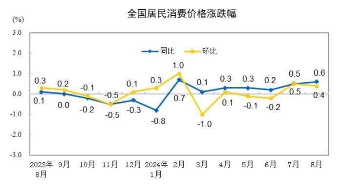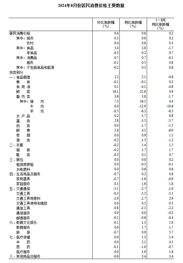 香港新聞網9月9日電 據中國國家統計局網站消息,2024年8月份,全國居民消費價格同比上漲0.6%。其中,城市上漲0.6%,農村上漲0.8%;食品價格上漲2.8%,非食品價格上漲0.2%;消費品價格上漲0.7%,服務價格上漲0.5%。1—8月平均,全國居民消費價格比上年同期上漲0.2%。 8月份,全國居民消費價格環比上漲0.4%。其中,城市上漲0.3%,農村上漲0.4%;食品價格上漲3.4%,非食品價格下降0.3%;消費品價格上漲0.7%,服務價格下降0.1%。