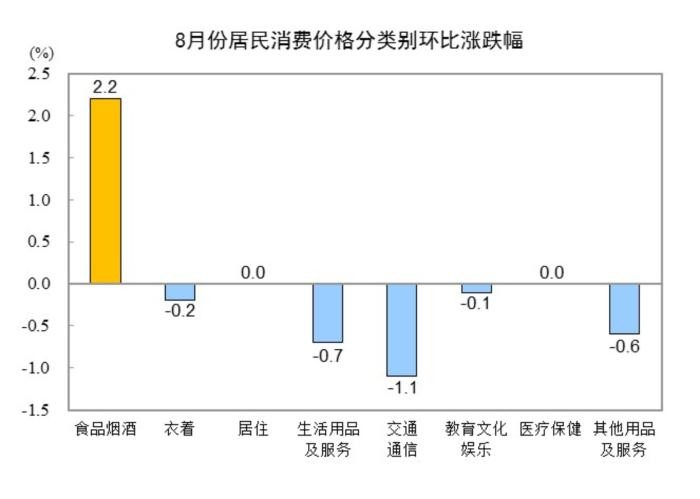 本文圖片均來自中國國家統計局網站 一、各類商品及服務價格同比變動情況 8月份,食品煙酒類價格同比上漲2.1%,影響CPI(居民消費價格指數)上漲約0.58個百分點。食品中,鮮菜價格上漲21.8%,影響CPI上漲約0.44個百分點;鮮果價格上漲4.1%,影響CPI上漲約0.08個百分點;畜肉類價格上漲3.8%,影響CPI上漲約0.12個百分點,其中豬肉價格上漲16.1%,影響CPI上漲約0.21個百分點;水產品價格上漲1.7%,影響CPI上漲約0.03個百分點;蛋類價格下降3.5%,影響CPI下降約0.02個百分點。 其他七大類價格同比五漲一平一降。其中,其他用品及服務、衣著價格分別上漲3.4%和1.4%,教育文化娛樂、醫療保健價格均上漲1.3%,生活用品及服務價格上漲0.2%;居住價格持平;交通通信價格下降2.7%。