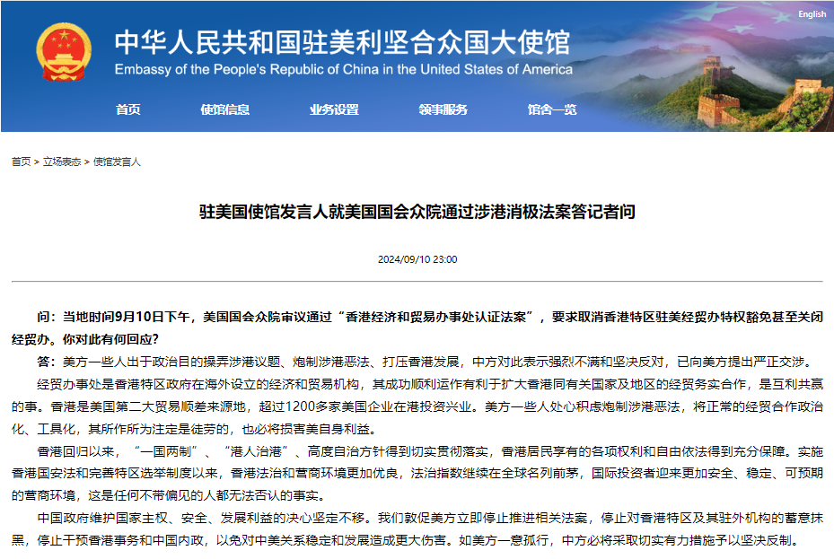 中國駐美國大使館網站截圖 問:當地時間9月10日下午,美國國會眾院審議通過“香港經濟和貿易辦事處認證法案”,要求取消香港特區駐美經貿辦特權豁免甚至關閉經貿辦。你對此有何回應? 答:美方一些人出於政治目的操弄涉港議題、炮製涉港惡法、打壓香港發展,中方對此表示強烈不滿和堅決反對,已向美方提出嚴正交涉。 經貿辦事處是香港特區政府在海外設立的經濟和貿易機構,其成功順利運作有利於擴大香港同有關國家及地區的經貿務實合作,是互利共贏的事。香港是美國第二大貿易順差來源地,超過1200多家美國企業在港投資興業。美方一些人處心積慮炮製涉港惡法,將正常的經貿合作政治化、工具化,其所作所為注定是徒勞的,也必將損害美自身利益。 香港回歸以來,“一國兩制”、“港人治港”、高度自治方針得到切實貫徹落實,香港居民享有的各項權利和自由依法得到充分保障。實施香港國安法和完善特區選舉制度以來,香港法治和營商環境更加優良,法治指數繼續在全球名列前茅,國際投資者迎來更加安全、穩定、可預期的營商環境,這是任何不帶偏見的人都無法否認的事實。 中國政府維護國家主權、安全、發展利益的決心堅定不移。我們敦促美方立即停止推進相關法案,停止對香港特區及其駐外機構的蓄意抹黑,停止干預香港事務和中國內政,以免對中美關係穩定和發展造成更大傷害。如美方一意孤行,中方必將採取切實有力措施予以堅決反制。(完) 【編輯:丘志彬】