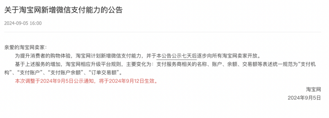 淘寶曾於9月初公告計劃新增微信支付能力,允許商戶接入微信支付方式。彼時公告顯示,基於上述服務的增加,淘寶網相應升級平台規則,主要變化為:支付服務商相關的名稱、賬戶、餘額、交易額等表述統一規範為“支付機構”“支付賬戶”“支付賬戶餘額”“訂單交易額”。本次調整於2024年9月5日公示通知,將於2024年9月12日生效。