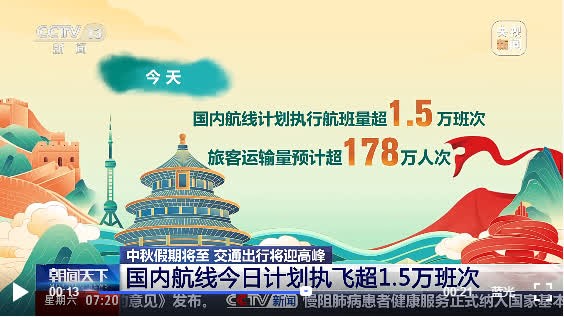 央視新聞視頻截圖 今年中秋節期間,預計公眾出行以探親及中短途周邊遊為主。高峰時段,公路網進出城主要通道、環路與放射性線交叉處和通往熱門景區的旅遊路線的關鍵點、段,將出現車流集中甚至擁堵情況。預計北京今天(14日)會出現公路網峰值,交通量預計達635萬輛次,較平日增長約9%。 另外,高速公路可能會出現流量較大情況。高速公路充電高峰預計出現在9月15日,高峰時段是10時到20時。17日出現返程充電高峰,高峰時段集中在10時到21時。 提醒廣大車主: 中秋節期間小型客車通行高速不免費。 建議車主提前規劃行程,注意最新路況信息,避免高峰時段出行。 中秋節期間,早晚溫差較大,夜間外出注意增添衣服,謹防感冒。 中國國內航線今日計劃執飛超1.5萬班次 航旅縱橫大數據顯示:今天,國內航線計劃執行航班量超1.5萬班次,旅客運輸量預計超178萬人次。出入境航線計劃執行航班量超2300班次,旅客運輸量預計超24萬人次。