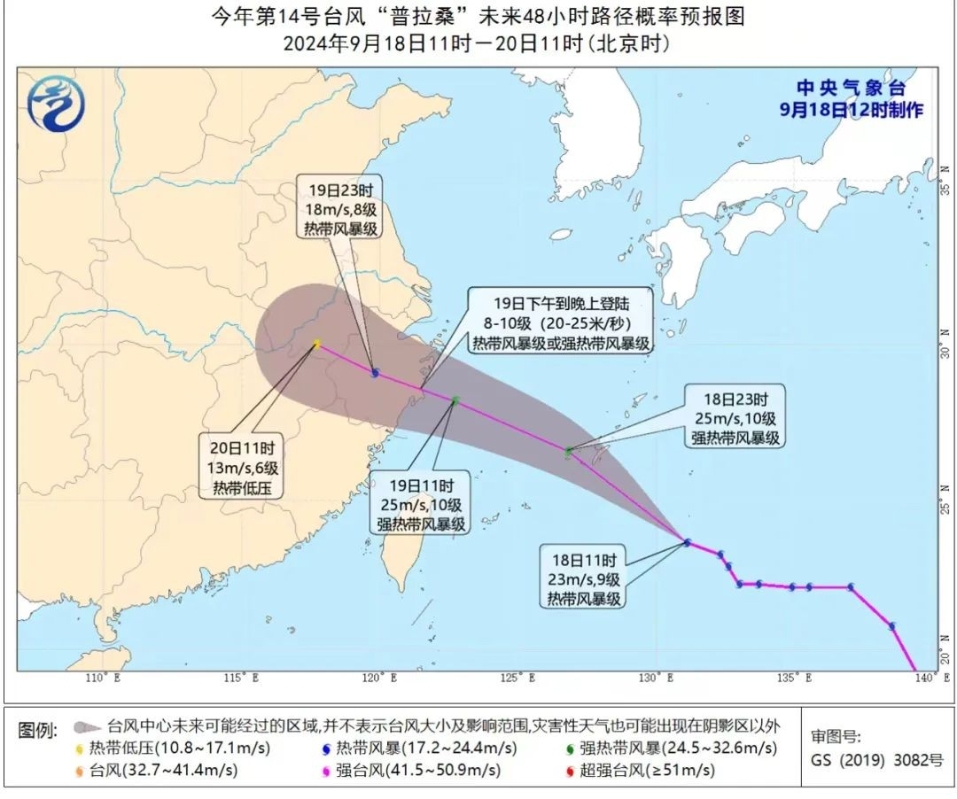 中央氣象台圖片 據“上海發布”微信公眾號消息,預計19日早晨到上半夜上海市將出現陣風7至8級、高層建築及沿江沿海地區8至9級的大風,籲請公眾注意防範颱風對高空作業、交通出行、設施農業等的不利影響。 這是繼颱風“貝碧嘉”後,另一個對上海構成威脅的颱風。上海市氣象服務中心稱,“普拉桑”的中心在18日上午11時,位於距離琉球群島那霸市東南方向約450公里的洋面上,強度為熱帶風暴級。 該中心預計“普拉桑”將以每小時45至50公里的速度向西北方向快速移動,強度變化不大,18日晚上移入中國東海東部海面,並將於19日下午到夜間在浙江沿海溫嶺附近登陸。登陸時強度為熱帶風暴級或強熱帶風暴級,之後強度逐漸減弱。(完) 【編輯:淩玉輝】