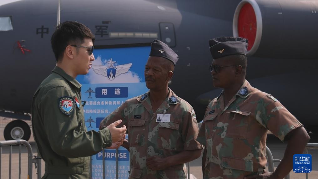 9月18日,中國空軍運-20機組成員在南非首都比勒陀利亞的非洲航空航天與防務展上向外國友人進行介紹。新華社發(王銳傑攝) 開幕式當天,在靜態展示區,運-20與數十架各國戰機整齊列陣,飛機尾翼上的五星紅旗格外耀眼。南非華人華僑紛紛前往現場,在異國他鄉拍下與國之重器、與五星紅旗的“團圓照”。 近年來,運-20已常態化出國執行各類任務:2022年,在奧地利“空中力量-2022”航展上亮相進行靜態展示;2022年,飛赴湯加執行人道主義救援任務;2024年,與空軍八一飛行表演隊6架殲-10表演機編隊飛越金字塔,并在埃及阿拉曼機場實現海外飛行“首秀”……