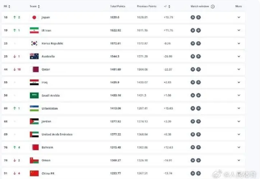 圖:人民體育 今年7月公布的上一期國際足聯會員協會男足代表隊(男足國家隊)國際排名榜顯示,中國隊位列世界第87位,亞洲第13位。不過,在9月5日、10日進行的18強賽前兩輪比賽中,中國隊相繼以0比7不敵日本隊、以1比2不敵沙特隊,從而遭遇兩連敗。雖然這兩個對手的檔位及國際排名均高於中國隊,但因為輸球必被扣除一定的積分,中國隊的世界排名也因此將下滑4位,至世界第91位。 值得注意的是,上期排名榜顯示,中國隊以1267.51分位列亞洲第13位,而當時暫列亞洲第14位的叙利亞隊積1246.68分,兩隊之間積分差超過20分。雖然叙利亞隊未能躋身18強賽,但因他們在9月的國際熱身賽中取得連勝並收穫6.23分,而中國隊則因兩連敗被扣掉13.74分,此消彼長之間,兩隊的積分差將縮小至不足1分。這意味著,中國隊如若在接下來的18強賽第3、第4輪比賽中仍無法止住連敗頽勢,那麼被叙利亞隊在排名榜上反超,將是大概率事件。 中國隊世界排名上一次跌破90名開外,已經是8年半前的事情。在2016年3月公布的那期國際排名榜中,中國隊位列世界第96位。中國男足歷史最低國際排名是世界第109位。 國際足聯官網的信息顯示,日本隊的世界排名提升了2位,至第18位,同時繼續領跑亞洲各隊排名榜。(完) 【編輯:李彥洲】