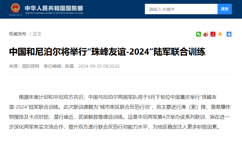 香港新聞網9月20日電 據中國國防部網站9月20日消息,根據年度計劃和中尼雙方共識,中國與尼泊爾兩國軍隊將於9月下旬位中國重慶舉行“珠峰友誼-2024”陸軍聯合訓練。此次聯訓課題為“城市街區聯合反恐行動”,將主要進行滑(索)降、簡易爆炸物搜排及卡點封鎖、潛行接近、武裝解救等課目訓練。 這是中尼兩軍第4次舉辦該系列聯訓,旨在進一步深化兩軍務實交流合作,提升雙方遂行聯合反恐行動能力水平,為地區穩定注入更多積極因素。