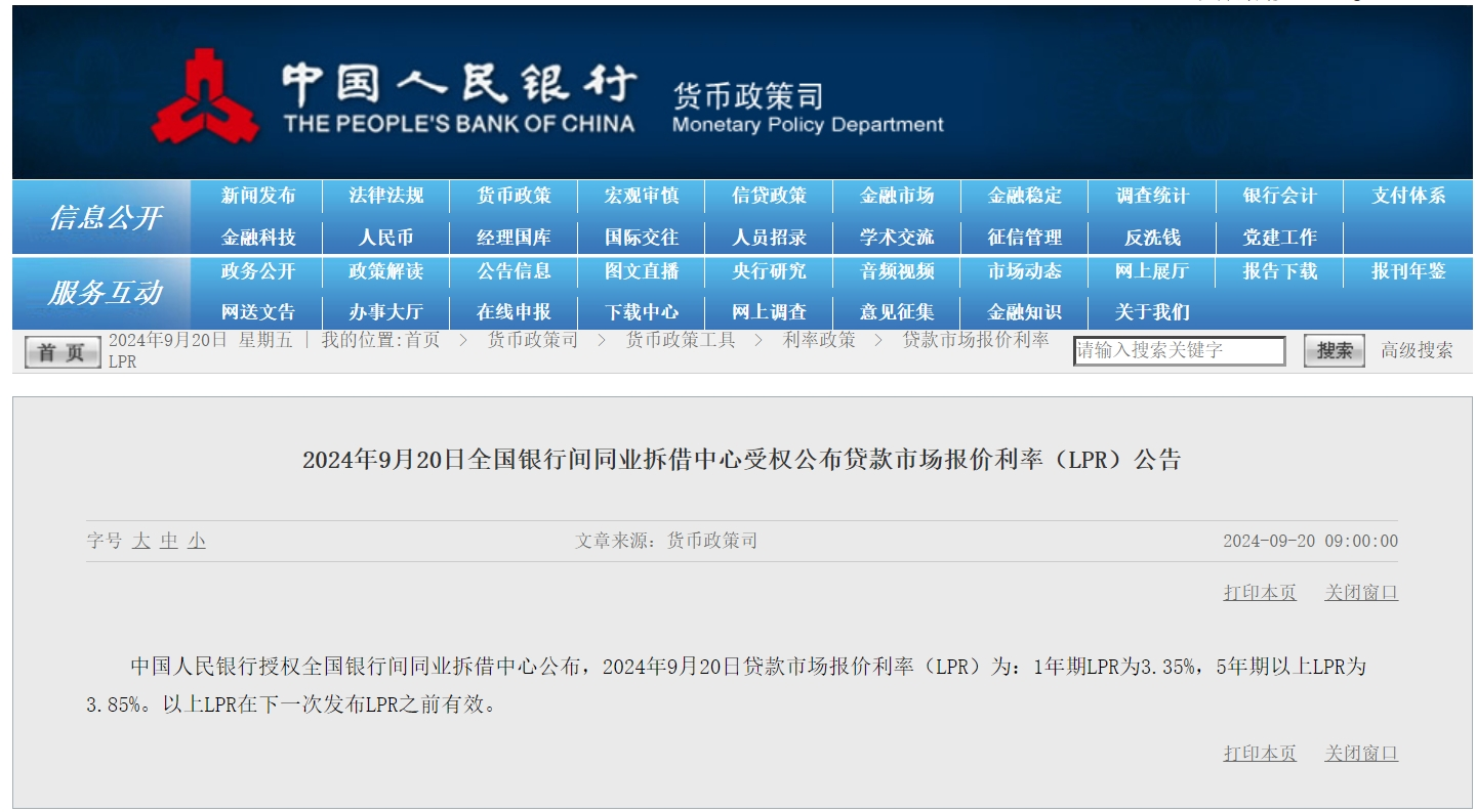 上月公佈的2024年8月20日貸款市場報價利率(LPR)為:1年期LPR為3.35%,5年期以上LPR為3.85%。(完)