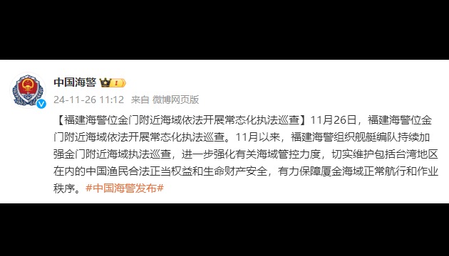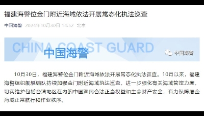 截圖自“中國海警”微信公眾號 中國海警表示,9月以來,福建海警組織艦艇編隊持續加強金門附近海域執法巡查,進一步強化有關海域管控力度,切實維護包括台灣地區在內的中國漁民合法正當權益和生命財產安全,有力保障廈金海域正常航行和作業秩序。 對於大陸海警船在金門附近海域開展執法巡查行動,大陸方面多次強調,海峽兩岸同屬一個中國,台灣是中國的一部分,廈金海域根本不存在所謂“禁止、限制水域”一說。大陸海警部門在金門附近海域開展常態化執法巡查行動,有利於維護相關海域正常秩序,保障兩岸漁民生命財產安全。(完) 【編輯:丘志彬】