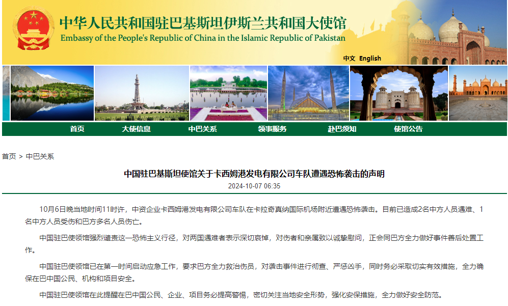 香港中通社10月7日電 據中國駐巴基斯坦大使館微信公眾號消息,一中企車隊10月6日晚在巴基斯坦遭遇恐怖襲擊,襲擊造成2名中方人員遇難。