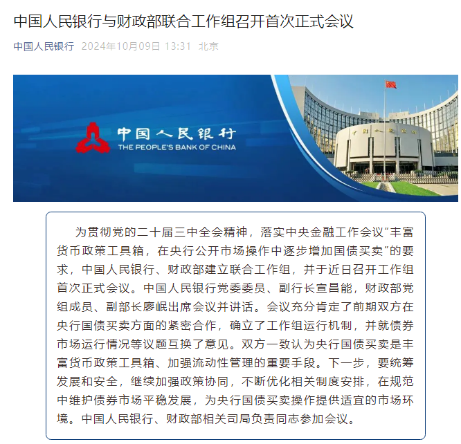 香港新聞網10月9日電 據微信公眾號“中國人民銀行”10月9日消息,為落實中央金融工作會議“豐富貨幣政策工具箱,在央行公開市場操作中逐步增加國債買賣”的要求,中國人民銀行、財政部建立聯合工作組,并於近日召開工作組首次正式會議。 會議肯定了前期雙方在央行國債買賣方面的緊密合作,確立了工作組運行機制,并就債券市場運行情況等議題互換了意見。雙方一致認為央行國債買賣是豐富貨幣政策工具箱、加強流動性管理的重要手段。下一步,要統籌發展和安全,繼續加強政策協同,不斷優化相關制度安排,在規範中維護債券市場平穩發展,為央行國債買賣操作提供適宜的市場環境。