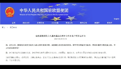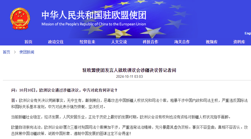 香港中通社10月11日電 中國駐歐盟使團10日回應歐洲議會(歐盟監督、諮詢和立法機構)當日涉疆決議,表示有關決議惡毒攻擊新疆人權狀況和司法個案,嚴重違背法治精神,充分暴露歐方虛偽雙標。 中國駐歐盟使團發言人表示,歐洲議會有關決議罔顧事實,無中生有,顛倒黑白,惡毒攻擊新疆人權狀況和司法個案,粗暴干涉中國內政和司法主權,嚴重違反國際法和國際關係基本準則,中方對此表示強烈憤慨、堅決反對。 發言人強調,當前新疆社會穩定,經濟發展,人民安居樂業,正處於歷史上最好的發展時期。歐洲議會沒有權利也沒有資格對新疆人權狀況指手畫腳。 發言人表示,歐盟自詡崇尚法治,歐洲議會卻屢次三番對別國司法個案橫加干涉,嚴重違背法治精神,充分暴露其虛偽雙標。攻擊抹黑中國治疆政策、詆毀中國形象、遏制中國發展的圖謀注定不會得逞。
