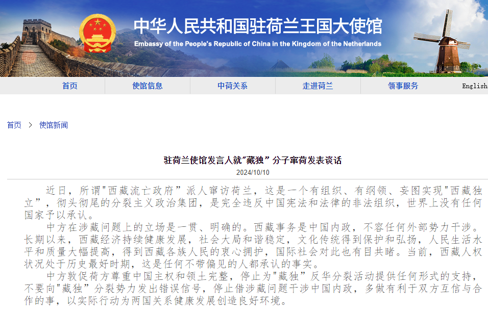 中國駐歐盟使團網站截圖 中國駐荷蘭使館發言人10日就“藏獨”分子竄荷發表談話,敦促荷方停止為“藏獨”反華分裂活動提供任何形式的支持,停止借涉藏問題干涉中國內政。 中國駐荷蘭使館發言人表示,近日,所謂“西藏流亡政府”派人竄訪荷蘭,這是一個有組織、有綱領、妄圖實現“西藏獨立”,徹頭徹尾的分裂主義政治集團,是完全違反中國憲法和法律的非法組織,世界上沒有任何國家予以承認。 發言人強調,中方在涉藏問題上的立場是一貫、明確的。西藏事務是中國內政,不容任何外部勢力干涉。長期以來,西藏經濟持續健康發展,社會大局和諧穩定,文化傳統得到保護和弘揚,人民生活水平和質量大幅提高,得到西藏各族人民的衷心擁護,國際社會對此也有目共睹。當前,西藏的人權事業發展處於歷史最好時期,這是任何不帶偏見的人都承認的事實。 發言人表示,中方敦促荷方尊重中國主權和領土完整,停止為“藏獨”反華分裂活動提供任何形式的支持,不要向“藏獨”分裂勢力發出錯誤信號,停止借涉藏問題干涉中國內政,多做有利於雙方互信與合作的事,以實際行動為兩國關係健康發展創造良好環境。