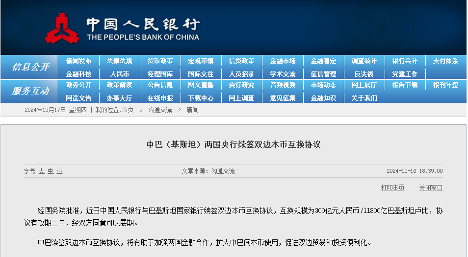 香港新聞網10月17日電 據中國人民銀行網站消息,經中國國務院批准,近日中國人民銀行與巴基斯坦國家銀行續簽雙邊本幣互換協議,互換規模為300億元人民幣/11800億巴基斯坦盧比,協議有效期三年,經雙方同意可以展期。