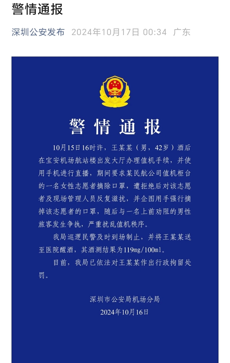 警情通報 圖片來源:“深圳公安發佈”官方微信公眾號截圖 通報指,10月15日16時許,主播王某某(男,42歲)酒後在寶安機場航站樓出發大廳辦理值機手續,並使用手機進行直播,期間要求某民航公司值機櫃台的一名女性志願者摘除口罩,遭拒絕後對該志願者及現場管理人員反復滋擾,並企圖用手強行摘掉該志願者的口罩,隨後與一名上前勸阻的男性旅客發生爭執,嚴重擾亂值機秩序。 深圳市公安局機場分局巡邏民警及時到場制止,並將王某某送至醫院醒酒,其酒測結果為119mg/100ml。目前,深圳市公安局機場分局已依法對王某某作出行政拘留處罰。 視頻顯示,“小虎行”指著一名紅衣志願者稱,“憑什麼戴口罩,憑什麼不摘,我就給你摘,我就碰你了,去報警吧。”他還想動手摘掉對方的口罩,並不斷逼問,“為什麼不摘口罩?”志願者一度受驚捂住了臉。 此事引發熱議後,不少網友吐槽“小虎行”的行為離譜,並曝出他之前曾“要求空姐蹲下服務”、“投訴空姐衣服有褶皺”等。據了解,“小虎行”在一短視頻平台有6萬粉絲,個人簡介為專注資管與評測航司。目前,其賬號已被無限期封禁。(完) 【編輯:林曉惠】