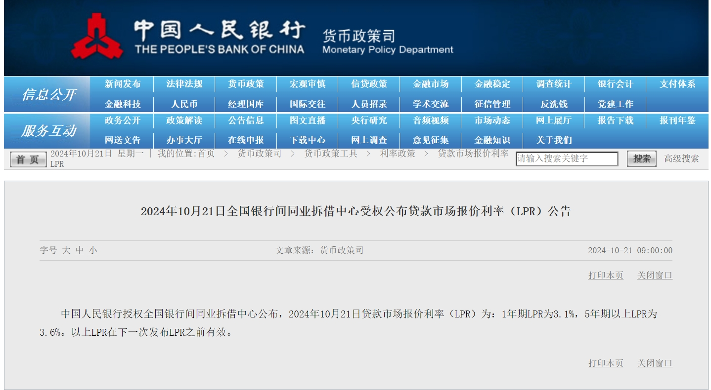 香港新聞網10月21日電 10月21日,中國人民銀行授權全國銀行間同業拆借中心公佈,2024年10月21日貸款市場報價利率(LPR)為:1年期LPR為3.1%,5年期以上LPR為3.6%。以上LPR在下一次發佈LPR之前有效。