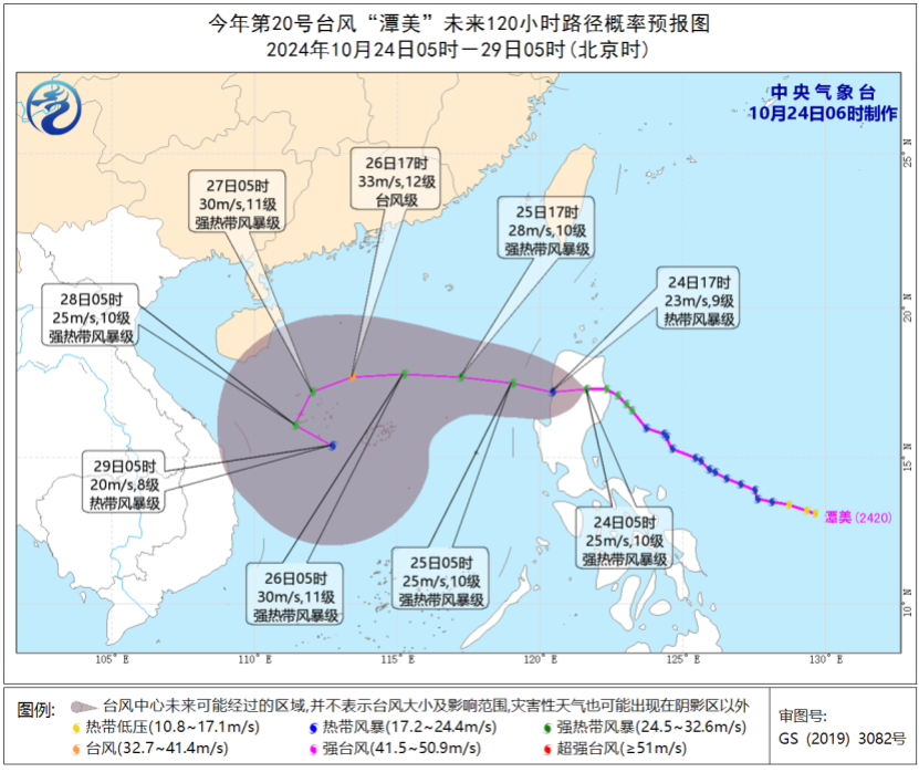 今年第20號颱風“潭美”未來120小時路徑概率預報圖(圖源:中國中央氣象台) 今晨,中國中央氣象台仍繼續發佈大風黃色預警。預計10月24日08時至25日08時,東海南部海域、台灣海峽、台灣以東洋面、南海東北部和中東部海域將有7~9級、陣風10級大風,其中台灣海峽的風力可達10級、陣風11級。 受颱風“潭美”影響,24日至27日,中國江蘇南部、上海、安徽東南部、浙江北部和東部、福建東北部、台灣島、廣東西南部、廣西東南部、海南島和三沙等地將有大到暴雨,其中浙江東南部、台灣島東部、海南島和三沙等地的部分地區有大暴雨,局地特大暴雨。 另外,25日至28日,受弱冷空氣影響,中國大部地區將有3-6℃的降溫,局地降幅可達8℃;中東部大部地區有陰雨,青藏高原東部有小到中雪或雨夾雪,局地大到暴雪。氣象專家提醒,颱風和冷空氣雙重發力,華東沿海及台灣、海南等地需注意防禦較強降雨,中東部地區氣溫起伏多變,早晚溫差大,注意添衣保暖。(完) 【編輯:丘志彬】