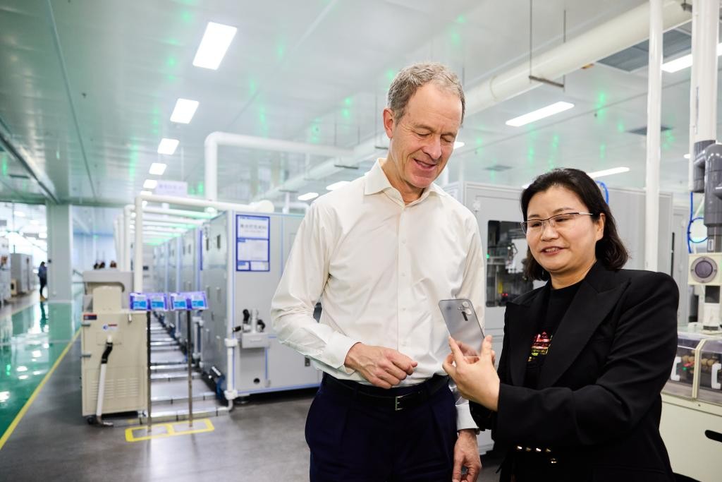 10月23日,蘋果公司首席運營官傑夫·威廉姆斯(左)與藍思科技董事長周群飛參觀藍思科技位於湖南長沙的工廠。新華社發(受訪者供圖) 威廉姆斯表示,藍思科技計劃建立的研究院將成為蘋果在華七個研發中心的有益補充。目前,蘋果在上海和深圳都有應用研究實驗室,不僅服務當地,也服務全世界。 在立訊精密位於江蘇蘇州的iPhone16系列總裝工廠,機械手搭配視覺引導,將零部件放入不同的載具,傳送、生產、視覺、上料等8個模組精密配合。在這裡,單條全自動產線一天可生產超過1萬台iPhone16 Pro Max。