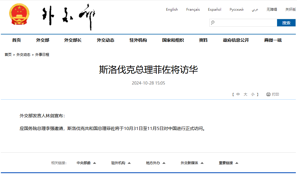 中國外交部網站截圖 另據央視新聞客戶端消息,10月28日,中外交部發言人林劍主持例行記者會。有記者就斯洛伐克共和國總理菲佐將於10月31日至11月5日對中國進行正式訪問一事提問。 對此,林劍表示,中方歡迎菲佐總理來華進行正式訪問。林劍指出,斯洛伐克是最早承認新中國的國家之一,兩國傳統友誼深厚。今年是中斯建交75周年,兩國關係呈現蓬勃發展勢頭,各領域的交流合作富有成果。中方願同斯方一道,以菲佐總理此訪為契機,深化兩國的傳統友誼和政治互信,拓展各領域交流合作,推進高質量共建“一帶一路”及中國—中東歐國家合作,推動雙邊關係邁上更高水平。(完) 【編輯:丘志彬】