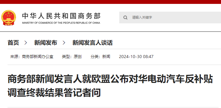香港新聞網10月30日電 據中國商務部網站10月30日消息,中國商務部新聞發言人就歐盟公佈對華電動汽車反補貼調查終裁結果答記者問。