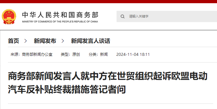 香港中通社11月4日電 11月4日,中國商務部新聞發言人表示,中方將就歐盟對華電動汽車反補貼終裁措施起訴至世貿組織爭端解決機制。