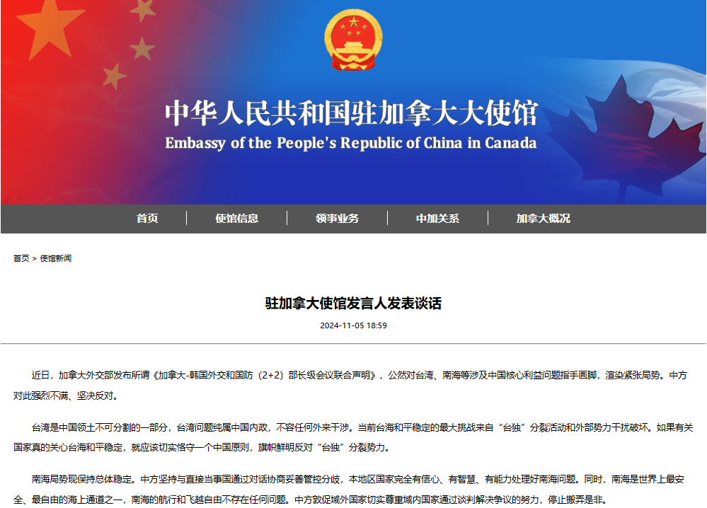 中國駐加拿大使館網站截圖 中國駐加拿大使館發言人當日說,台灣是中國領土不可分割的一部分,台灣問題純屬中國內政,不容任何外來干涉。當前台海和平穩定的最大挑戰來自“台獨”分裂活動和外部勢力干擾破壞。如果有關國家真的關心台海和平穩定,就應該切實恪守一個中國原則,旗幟鮮明反對“台獨”分裂勢力。 發言人說,南海局勢現保持總體穩定。中方堅持與直接當事國通過對話協商妥善管控分歧,本地區國家完全有信心、有智慧、有能力處理好南海問題。同時,南海是世界上最安全、最自由的海上通道之一,南海的航行和飛越自由不存在任何問題。中方敦促域外國家切實尊重域內國家通過談判解決爭議的努力,停止搬弄是非。 就在10月20日,美國“希金斯”號驅逐艦、加拿大“溫哥華”號護衛艦過航台灣海峽並公開炒作。中國人民解放軍東部戰區組織海空兵力對美、加艦過航行動全程跟監警戒,依法依規處置。 去年以來,加拿大多次“遠道而來”介入南海局勢。加直升機意圖不明地盤旋於南海上空。去年10月23日,加“渥太華”號護衛艦曾和美、日、澳、新西蘭艦艇在南海軍演。(完) 【編輯:丘志彬】
