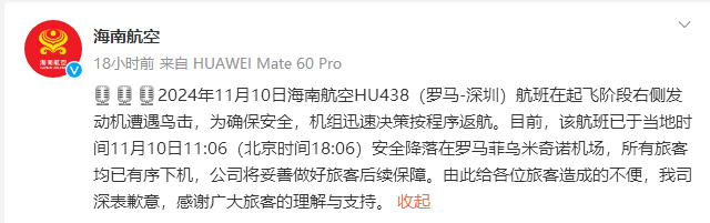 中國海南航空官方微博截圖 海南航空表示,目前,該航班已於當地時間11月10日11:06(北京時間18:06)安全降落在羅馬菲烏米奇諾機場,所有旅客均已有序下機,公司將妥善做好旅客後續保障。 鳥撞(Bird Strike),又稱鳥擊,是指在航空器低空飛行和接近著陸時,迎面受到飛鳥撞擊造成局部損傷的事件,後擴展到鳥類與高速列車、汽車、人工建築及其他設施相撞造成物件損壞和鳥類受傷事件。國際航空聯合會將鳥撞列入A級航空災難。(完) 【編輯:丘志彬】