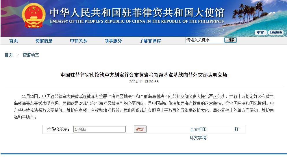 香港新聞網11月14日電 據中國駐菲律賓大使館網站,中國駐菲使館就中方劃定并公佈黃岩島領海基點基線向菲外交部表明立場。 11月13日,中國駐菲律賓大使黃溪連就菲方簽署“海洋區域法”和“群島海道法”向菲外交部負責人提出嚴正交涉,并就中方劃定并公佈黃岩島領海基點基線表明立場,強調這是對菲出台“海洋區域法”的必要回應,是中國政府依法加強海洋管理的正常舉措,符合國際法和國際慣例。中方將繼續依法採取必要措施,維護自身領土主權和海洋權益。我們敦促菲方立即停止採取可能導致爭議擴大化、局勢複雜化的單方面舉動,維護南海和平穩定。