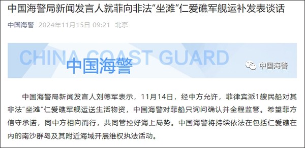 香港新聞網11月15日電 據中國海警官方微信公眾號消息,中國海警局新聞發言人劉德軍表示,11月14日,經中方允許,菲律賓派1艘民船對其非法“坐灘”仁愛礁軍艦運送生活物資,中國海警對菲船隻詢問確認并全程監管。希望菲方信守承諾,同中方相向而行,共同管控好海上局勢。中國海警將持續依法在包括仁愛礁在內的南沙群島及其附近海域開展維權執法活動。