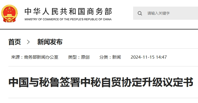 中國商務部網站截圖 此前,中秘雙方於2009年4月簽署自貿協定,於2018年11月啟動中秘自貿協定升級談判,並於2024年6月實質性完成。在原自貿協定基礎上,升級《議定書》進一步完善了原產地規則、海關程序與貿易便利化、衛生與植物衛生措施、知識產權、服務貿易、商務人員臨時入境和投資等7個協定原有章節,新增了標準與合格評定合作、競爭政策、電子商務、全球供應鏈、環境與貿易等5個章節。 中國商務部國際司負責人15日解讀稱,《議定書》的特色和亮點有三。一是對標國際高標準經貿規則,全面提升規則承諾水平。例如,《議定書》的全球供應鏈章節是中秘雙方在自貿協定項下的創新之舉,彰顯了兩國維護全球產業鏈供應鏈穩定的堅定立場。 二是積極推動標準合作,首次在自貿協定中專門設立標準與合格評定合作章節。中秘雙方同意在制定和改進標準、技術法規和合格評定程序以及標準和合格評定結果互認等方面加強合作,成立專門合作機制,並提出了合作清單。 三是積極推動優化營商環境,全面提升服務投資紀律水平。中國商務部國際司負責人稱,《議定書》有利於削減中秘兩國間服務貿易和投資有關限制和壁壘,不斷提高雙向貿易投資自由化便利化水平。(完) 【編輯:淩玉輝】