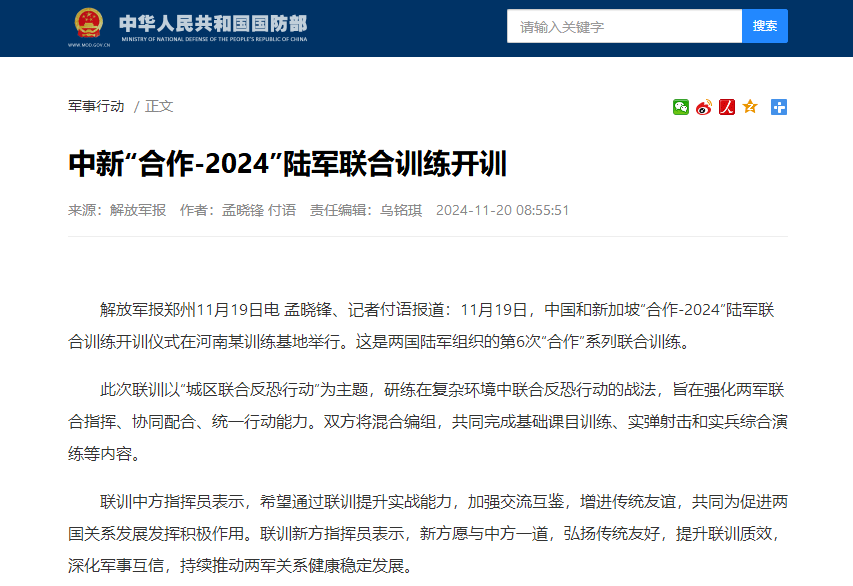 中國國防部網站截圖 據“國防部發布”20日消息,此次聯訓以“城區聯合反恐行動”為主題,研練在複雜環境中聯合反恐行動的戰法,旨在強化兩軍聯合指揮、協同配合、統一行動能力。雙方將混合編組,共同完成基礎課目訓練、實彈射擊和實兵綜合演練等內容。 聯訓中方指揮員表示,希望通過聯訓提升實戰能力,加強交流互鑒,增進傳統友誼,共同為促進兩國關係發展發揮積極作用。聯訓新方指揮員表示,新方願與中方一道,弘揚傳統友好,提升聯訓質效,深化軍事互信,持續推動兩軍關係健康穩定發展。(完) 【編輯:丘志彬】
