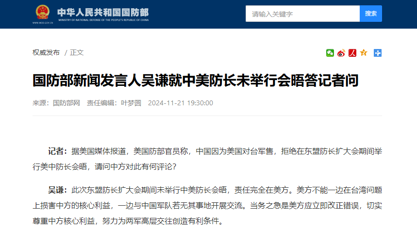 香港中通社11月21日電 第11屆東盟防長擴大會21日在老撾萬象舉行。對於大會期間未舉行中美防長會晤,中國國防部新聞發言人吳謙回應“責任完全在美方”。