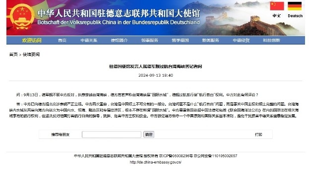 中國駐加拿大使館網站截圖 有記者提問,日前,台灣當局前領導人蔡英文赴加拿大參加哈利法克斯國際安全論壇年會,並接受該論壇授予的所謂“麥凱恩公共服務領袖獎”,請問中方對此有何評論? 駐加拿大使館發言人表示,中方在台灣問題上的立場是一貫的、明確的,堅決反對任何“台獨”分子以任何名義竄訪中國的建交國。中方敦促有關國家切實恪守一個中國原則,尊重中國主權和領土完整。 發言人指出,哈利法克斯國際安全論壇執意邀請“台獨”分子參會並為其頒獎,嚴重違反一個中國原則。中方對此強烈不滿、堅決反對,敦促哈利法克斯國家安全論壇充分認清台灣問題的極端重要性和高度敏感性,停止向“台獨”分裂勢力發出錯誤信號。(完) 【編輯:丘志彬】