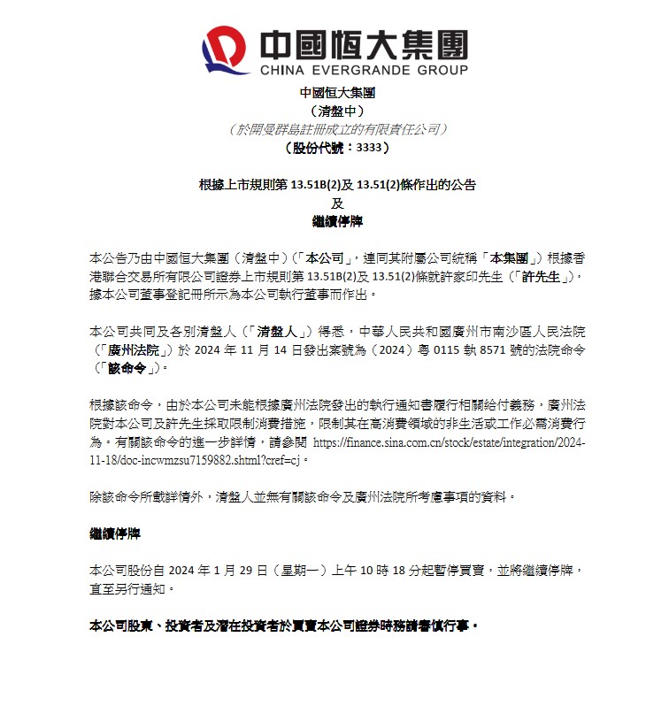 香港新聞網11月27日電 11月26日晚間,中國恒大集團發佈公告稱,廣州法院對公司及許家印採取限制消費措施,限制其在高消費領域的非生活或工作必需消費行為。 公告寫道:公司獲悉,廣州市南沙區人民法院於2024年11月14日發出案號為(2024)粵0115執8571號的法院命令。根據該命令,由於恒大集團未能根據廣州法院發出的執行通知書履行相關給付義務,廣州法院對公司及許家印採取限制消費措施,限制其在高消費領域的非生活或工作必需消費行為。 此外,恒大集團股份自2024年1月29日(星期一)上午10時18分起暫停買賣,并將繼續停牌。