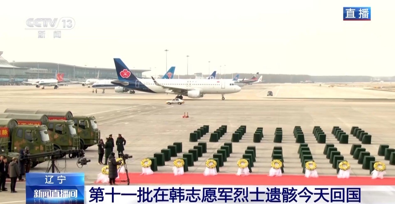 央視新聞報道截圖 裝殮儀式後,中韓雙方共同將烈士遺骸棺椁運送至韓國仁川國際機場。中方在仁川國際機場停機坪現場舉行莊嚴悼念儀式,中方人員激揚唱響雄壯的中華人民共和國國歌,中國駐韓國使館臨時代辦方坤為志願軍烈士遺骸棺椁一一覆蓋國旗,全體人員向志願軍烈士行三鞠躬禮,中國人民解放軍儀仗司禮大隊禮兵手持國旗領路,護送烈士遺骸棺椁登上解放軍空軍“運-20”專機。國歌激蕩人心,英魂鑄就輝煌,烈士英靈在國歌聲中回到祖國和人民懷抱。 中央宣傳部、中央對外聯絡部、外交部、國家發展改革委、財政部、退役軍人事務部、軍委政治工作部等軍地有關部門組成的中方交接代表團組、中國駐韓國使館國防武官等相關人員共同見證迎接志願軍烈士遺骸回家。 2014年以來,中韓雙方遵循國際法和人道主義原則,坦誠友好、務實合作,已連續11年成功交接981位在韓中國人民志願軍烈士遺骸及相關遺物。(完) 【編輯:丘志彬】