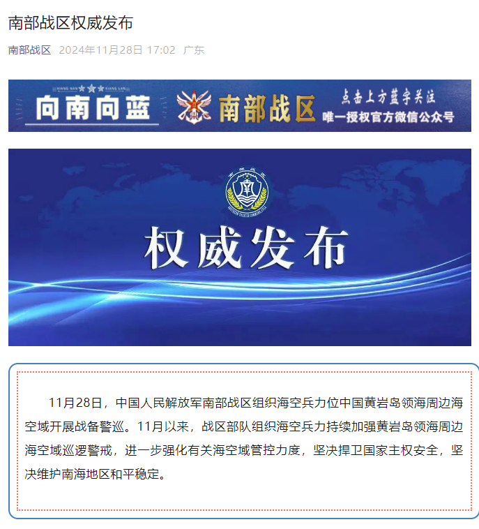 香港中通社11月28日電 據中國人民解放軍南部戰區28日消息,當天,該戰區組織海空兵力位中國黃岩島領海周邊海空域開展戰備警巡。 南部戰區表示,11月以來,戰區部隊組織海空兵力持續加強黃岩島領海周邊海空域巡邏警戒,進一步強化有關海空域管控力度,堅決捍衛國家主權安全,堅決維護南海地區和平穩定。