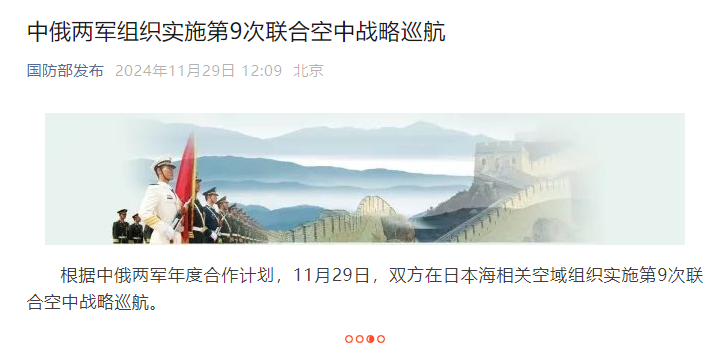香港中通社11月29日電 據“國防部發布”微信公眾號消息,根據中俄兩軍年度合作計劃,11月29日,雙方在日本海相關空域組織實施第9次聯合空中戰略巡航。