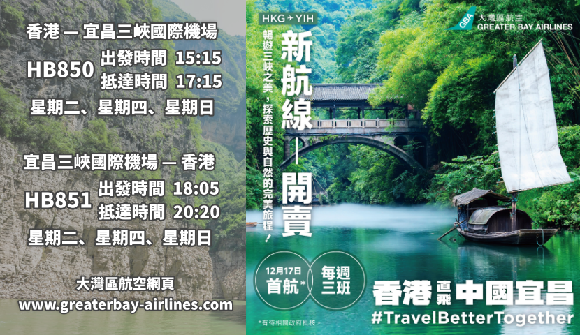 香港新聞網12月4日電 大灣區航空進一步拓展內地飛行網絡,將於12月17日開辦湖北省宜昌市的定期航班服務。新航線將提供一星期3班(逢星期二、四及日)來往香港與宜昌(宜昌三峽國際機場)的航班,航程約兩小時。