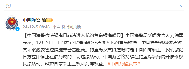 香港新聞網12月5日電 中國海警局新聞發言人劉德軍表示,12月5日,日“瑞寶丸”號漁船非法進入中國釣魚島領海,中國海警艦艇依法對其採取必要管控措施并警告驅離。