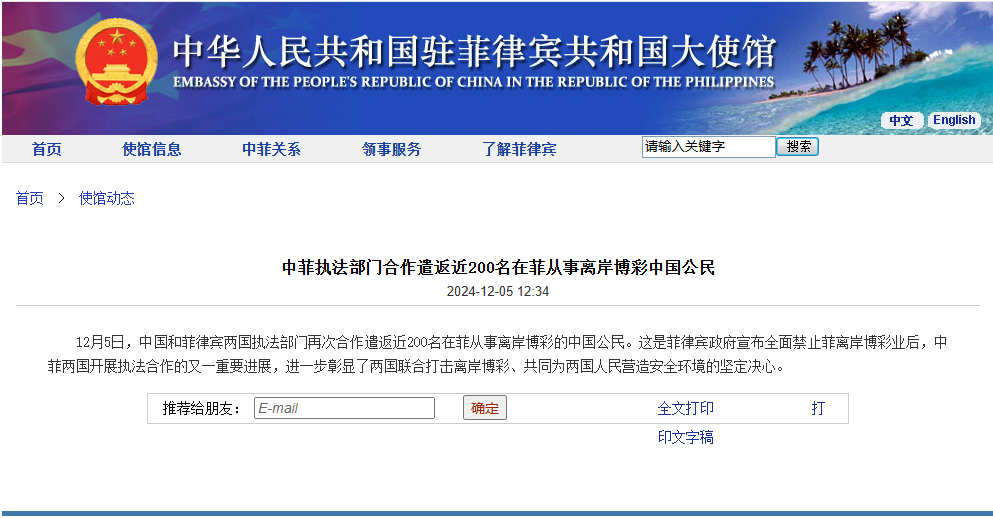 中國駐菲律賓大使館網站截圖 消息稱,這是菲律賓政府宣布全面禁止菲離岸博彩業後,中菲兩國開展執法合作的又一重要進展,進一步彰顯了兩國聯合打擊離岸博彩、共同為兩國人民營造安全環境的堅定決心。 自2016年菲律賓時任總統杜特爾特推動在線賭博合法化以來,菲律賓的離岸博彩業迅速擴張。許多離岸博彩機構向中國公民提供在線賭博服務。目前菲律賓有40多家獲有效經營許可證的離岸博彩機構及上百家非法機構,現任總統馬科斯已下令在今年年底前悉數關閉。 此前,中方多次呼籲菲方早日全面禁止離岸博彩業。中國駐菲律賓使館發言人7月25日表示,中國法律禁止一切形式的賭博。中國政府嚴厲打擊中國公民出境從事賭博業,包括離岸博彩等網絡賭博。菲離岸博彩業滋生惡性犯罪,嚴重損害兩國人民利益。對此,中方願與菲方繼續加強執法合作。(完) 【編輯:丘志彬】