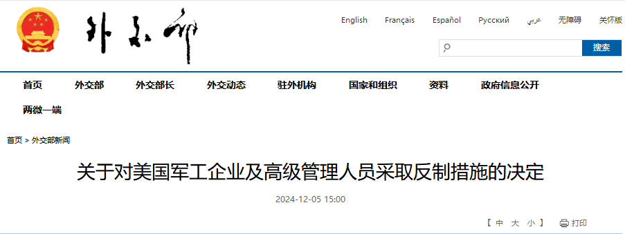 香港中通社12月5日電 12月5日,中國外交部發布《關於對美國軍工企業及高級管理人員採取反制措施的決定》指,對美國13家軍工企業及6名企業高級管理人員採取反制措施,即日起施行。