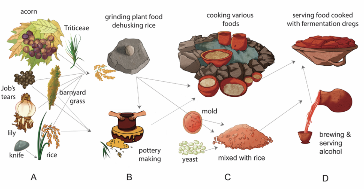 上山文化早期陶器與食物生產-消費過程重建(圖源:中國科學院網站) 上述研究表明,在稻米馴化早期階段,上山人群採用廣泛的生計策略并使用陶器,特別是利用小口罐來釀造以紅麴黴為主要糖化劑的稻米麴酒。這一釀造技術在上山文化早期出現,與稻米馴化和全新世早期溫暖濕潤的氣候相關。馴化稻為釀造發酵酒提供了穩定資源,而有利的氣候條件為真菌生長提供了理想的環境條件,從而促進酒精發酵技術的發展。研究認為,這些酒精飲品可能在儀式性宴饗活動中扮演了重要角色,凸顯酒精飲品作為人群交往及人神溝通儀式的媒介功能。稻米酒的這一特殊功能或是推動新石器時代中國水稻廣泛種植、利用和傳播的重要因素之一。 水稻馴化和稻米釀酒是東亞地區農業和食物文化的重要組成部分。研究上山文化的稻米釀酒證據,可以追溯東亞農業起源和早期飲食文化的形成過程。這對剖析水稻馴化路徑和技術演變乃至世界農業和釀酒史具有重要的填補性價值。這一研究揭示了早期稻米釀酒的複雜性與創新性,為探索東亞地區稻作農業的起源、早期社會結構和技術傳播提供了重要的科學依據。 12月10日,相關研究成果在線發表在《美國國家科學院院刊》(PNAS)上。研究工作得到國家自然科學基金等的支持。(完) 【編輯:丘志彬】